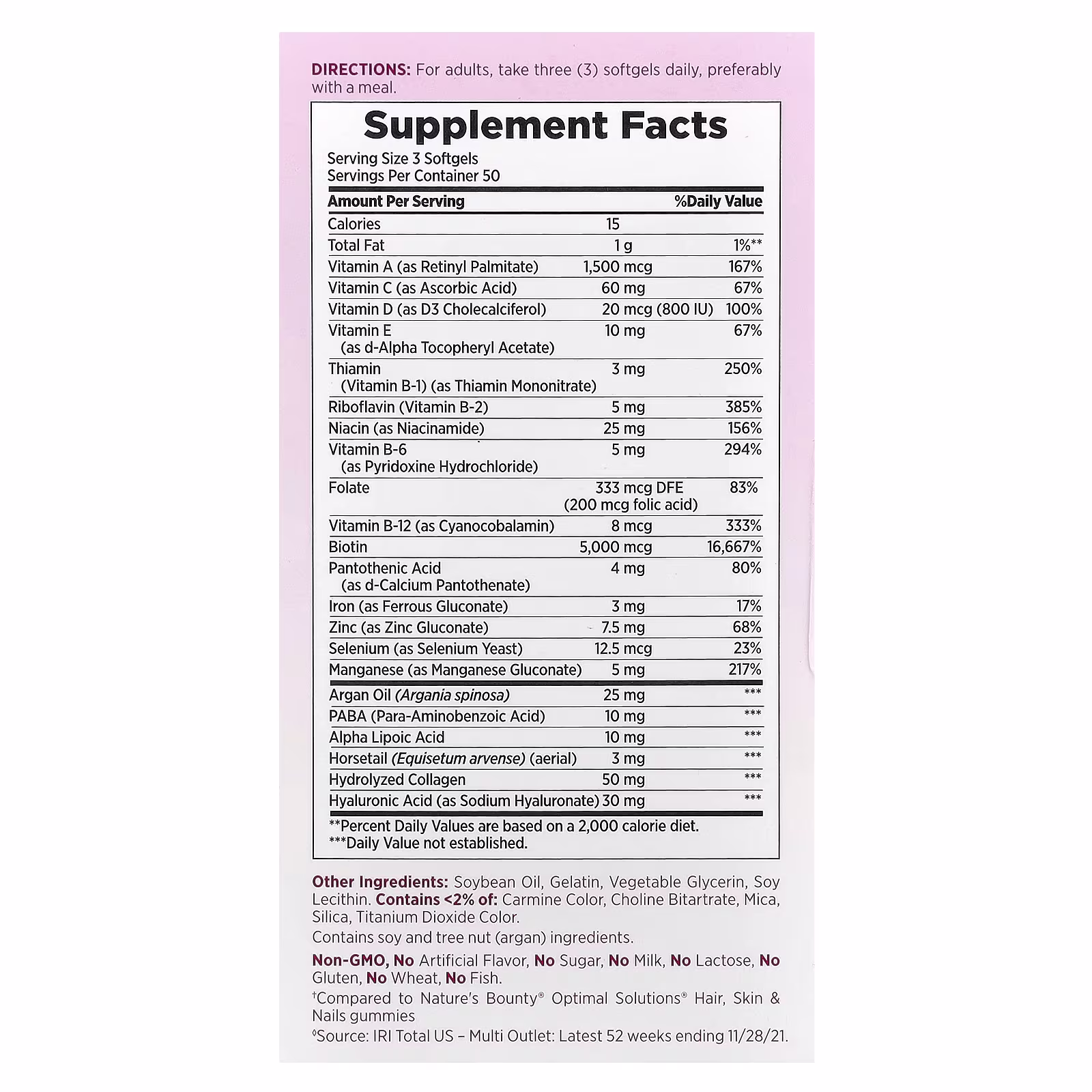 El suplemento Hair, Skin & Nails de Nature’s Bounty en presentación de 150 cápsulas blandas (softgels) es una fórmula avanzada diseñada para fortalecer el cabello, mejorar la apariencia de la piel y mantener uñas saludables desde el interior. Contiene una mezcla rica en biotina (5000 mcg), vitaminas antioxidantes como vitamina C y E, además de minerales clave como zinc y ácido hialurónico, que actúan de forma sinérgica para apoyar la belleza y nutrición de tejidos claves. Ideal para mujeres y hombres que desean fortalecer su apariencia con respaldo nutricional real.